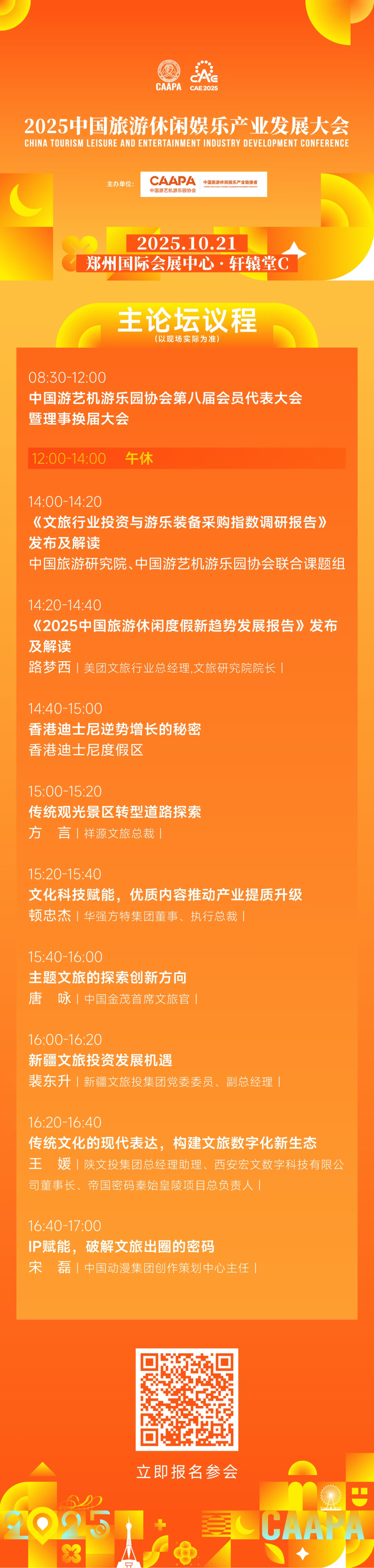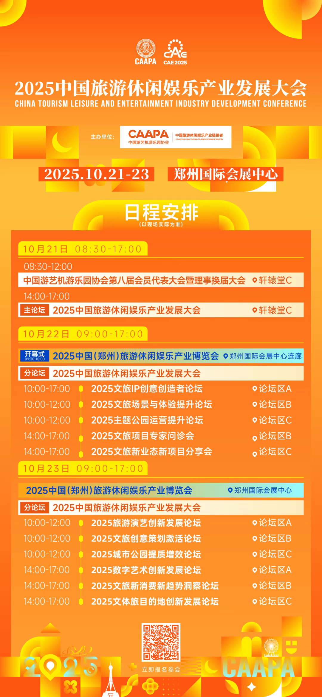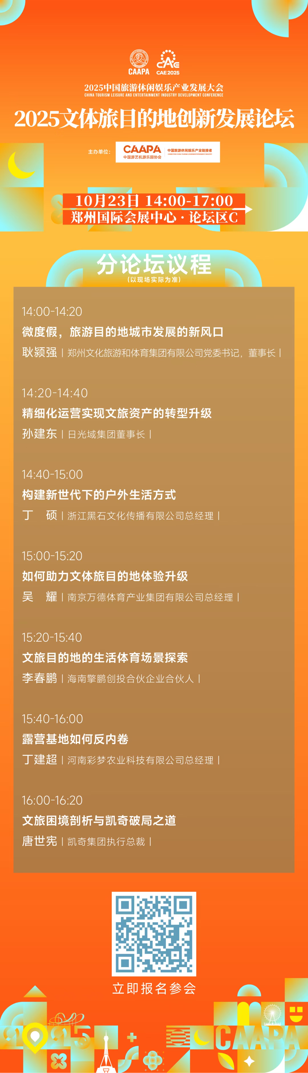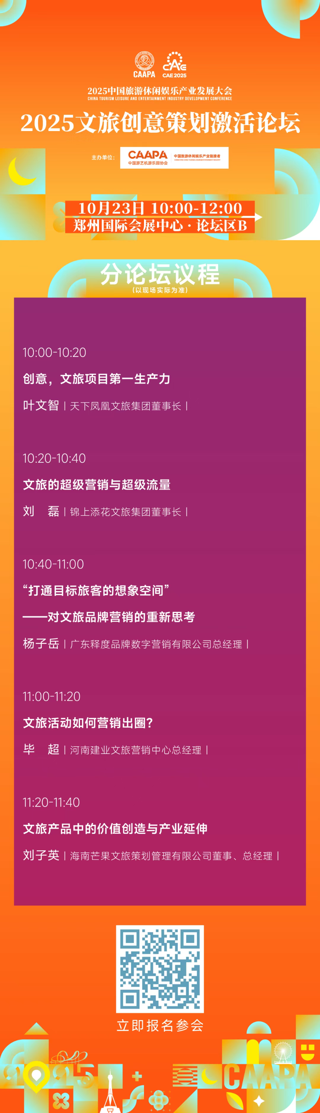 年会设置文旅IP创意创造者论坛、文旅场景与体验提升论坛、主题公园运营提升论坛、文旅项目专家问诊会、文旅新业态新项目分享会、旅游演艺创新发展论坛、文旅创意策划激活论坛、城市公园提质增效论坛、数字艺术创新发展论坛、文旅新消费新趋势洞察论坛、文体旅目的地创新发展论坛等11个专项论坛,并于10月22-24日举办2025中国(郑州)旅游休闲娱乐产业博览会,现发布大会完整议程如下: