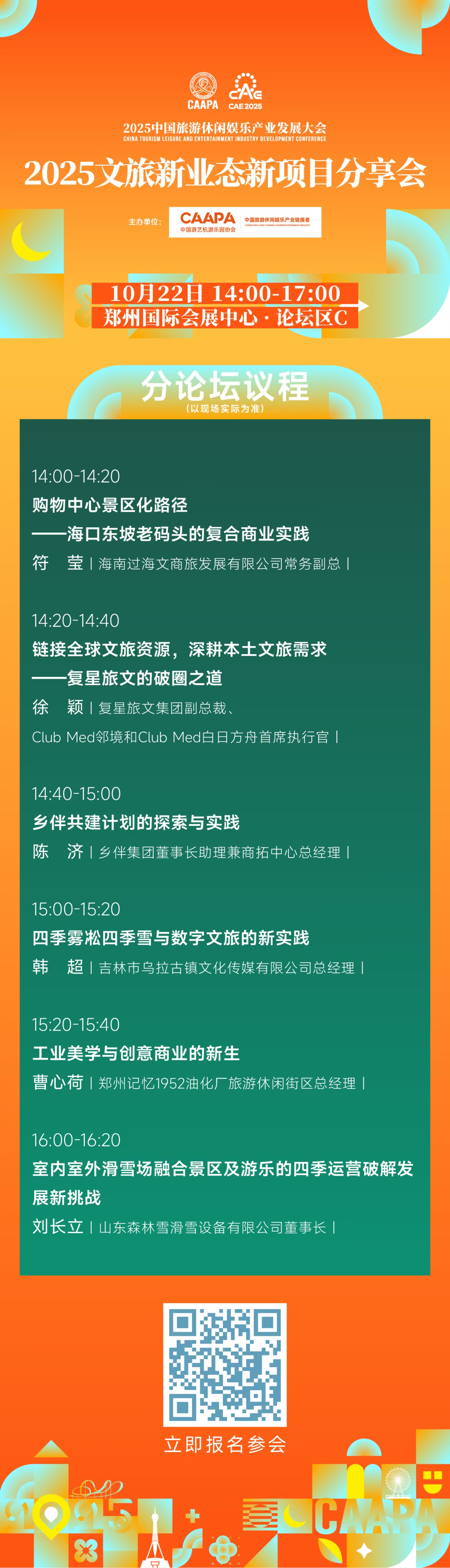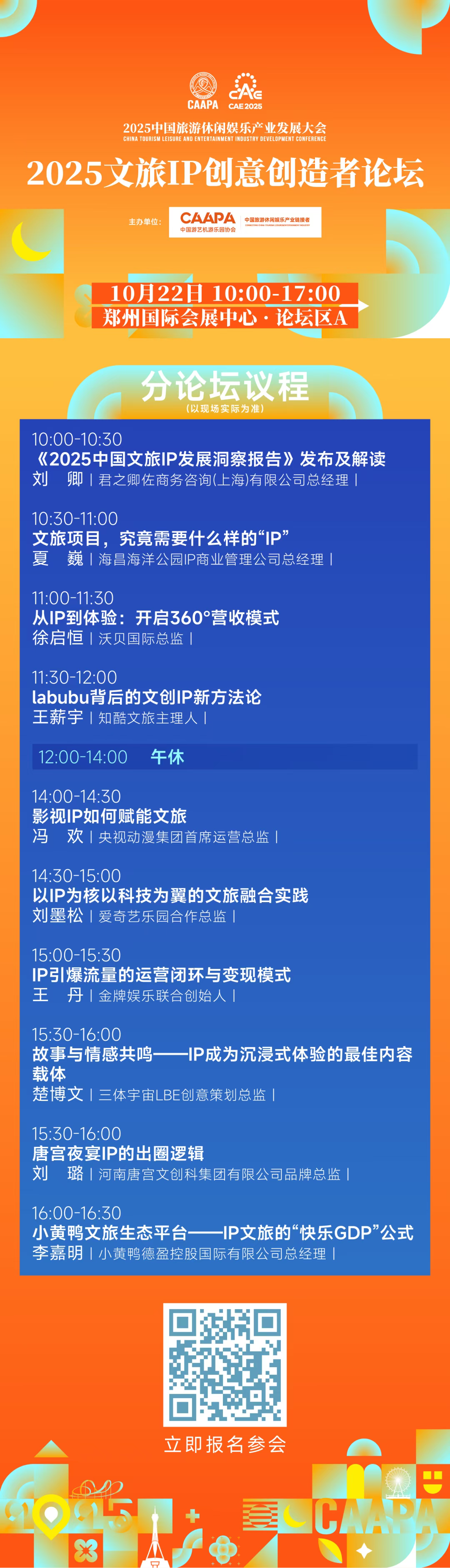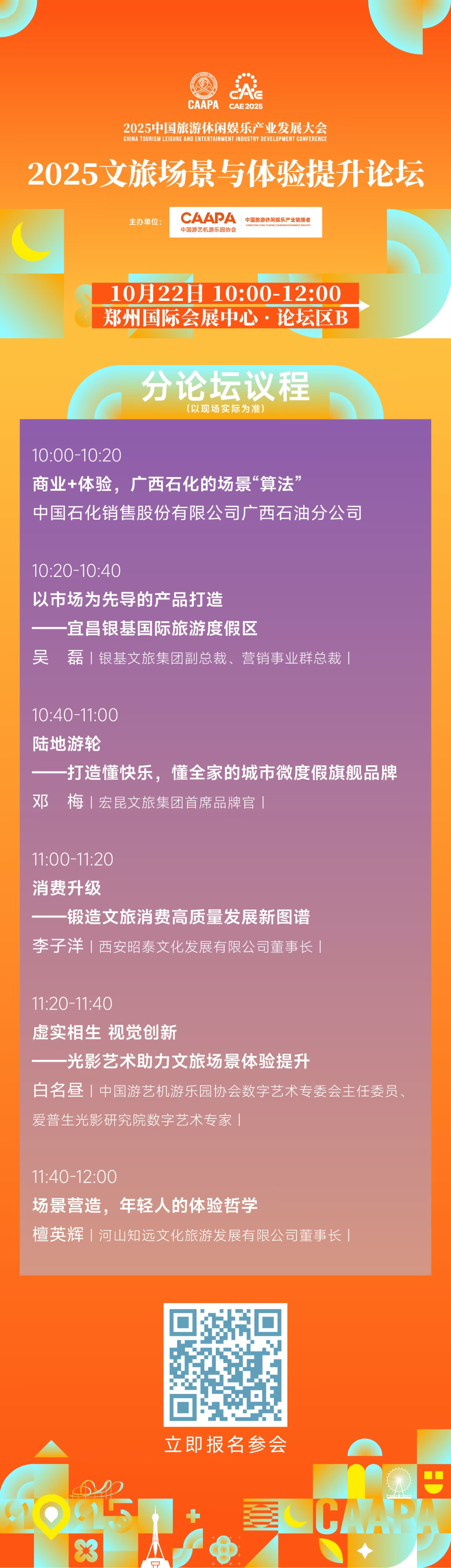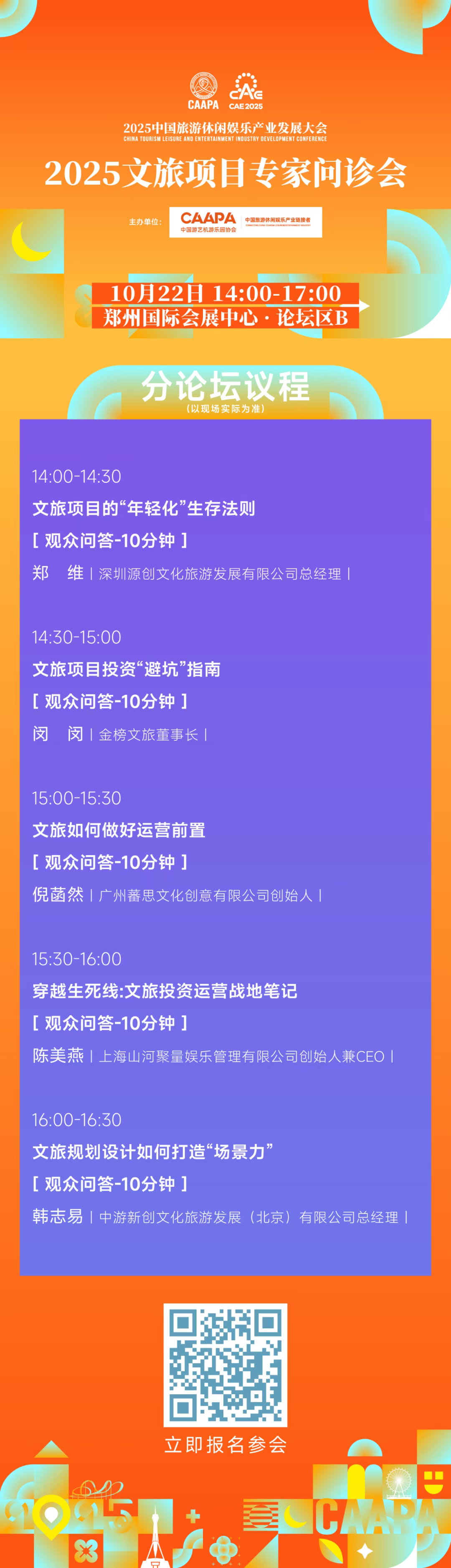 年会设置文旅IP创意创造者论坛、文旅场景与体验提升论坛、主题公园运营提升论坛、文旅项目专家问诊会、文旅新业态新项目分享会、旅游演艺创新发展论坛、文旅创意策划激活论坛、城市公园提质增效论坛、数字艺术创新发展论坛、文旅新消费新趋势洞察论坛、文体旅目的地创新发展论坛等11个专项论坛,并于10月22-24日举办2025中国(郑州)旅游休闲娱乐产业博览会,现发布大会完整议程如下: