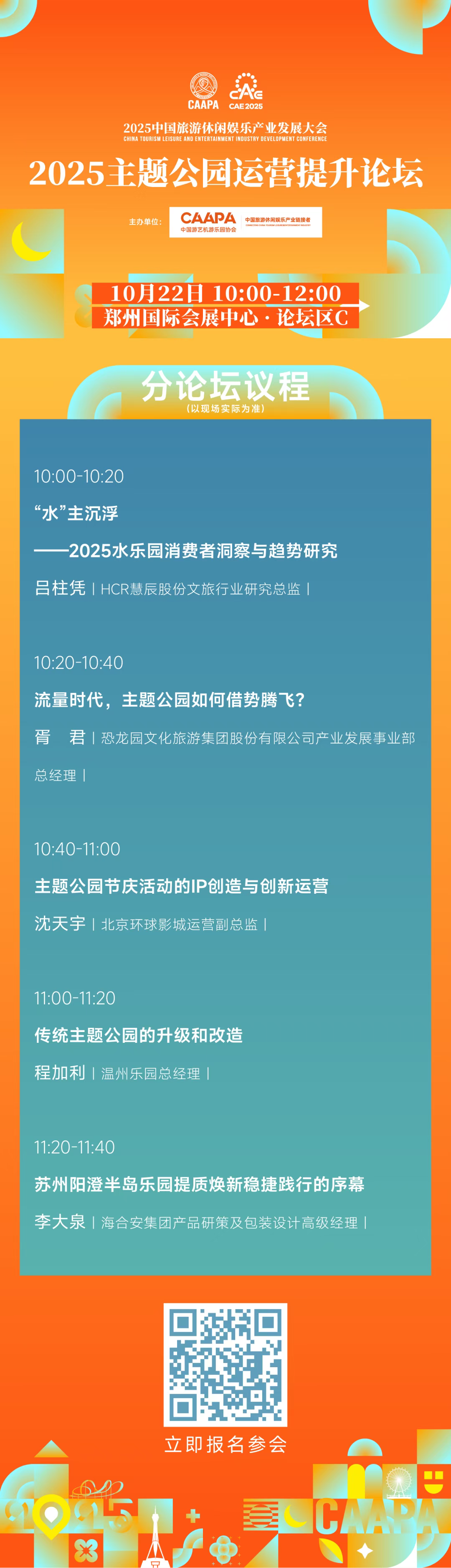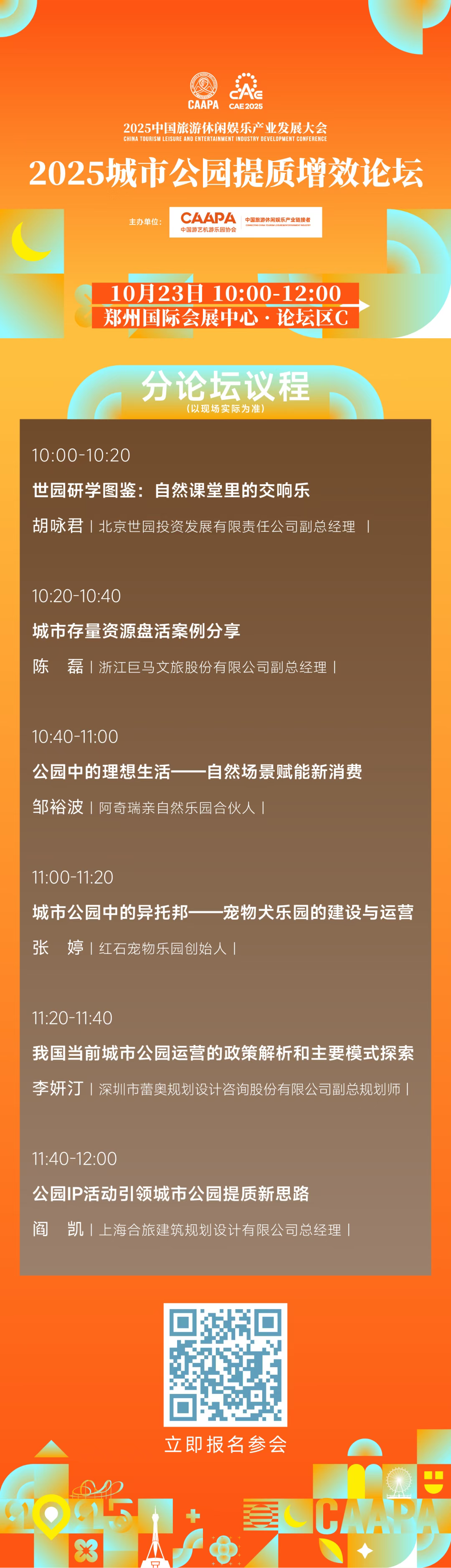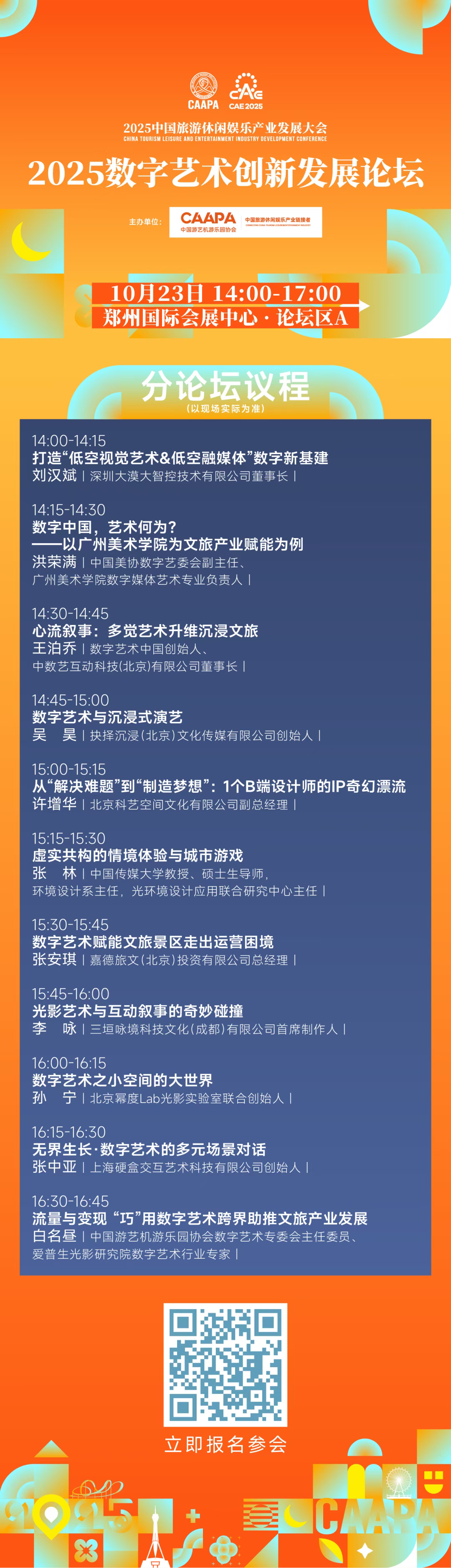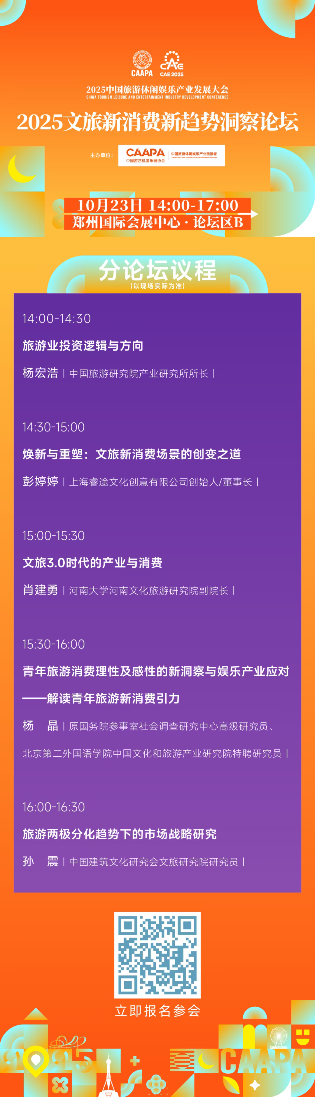 年会设置文旅IP创意创造者论坛、文旅场景与体验提升论坛、主题公园运营提升论坛、文旅项目专家问诊会、文旅新业态新项目分享会、旅游演艺创新发展论坛、文旅创意策划激活论坛、城市公园提质增效论坛、数字艺术创新发展论坛、文旅新消费新趋势洞察论坛、文体旅目的地创新发展论坛等11个专项论坛,并于10月22-24日举办2025中国(郑州)旅游休闲娱乐产业博览会,现发布大会完整议程如下: