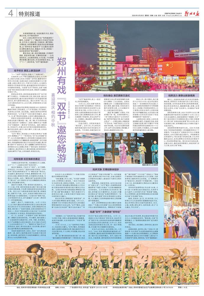 景区活动上新、街区面貌焕新、沉浸演艺更新、竞技体育出新、文博体验创新……从内容到形式,从优惠到体验,8天长假,千年商都满目新潮;聚在金秋,好友亲朋就在身边。这个“十一”,郑州有戏,“双节”邀您畅游!