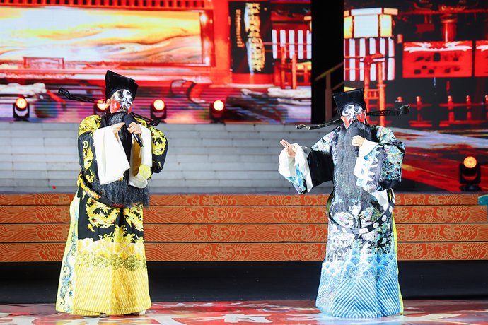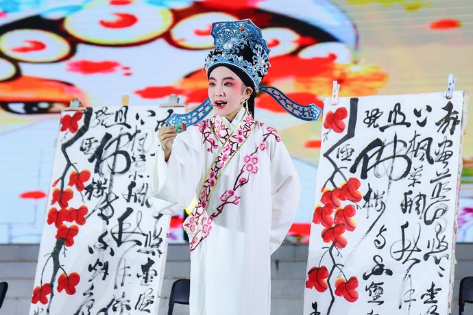 华灯初上,宫殿主舞台内光影交织。数字化戏曲主题灯光秀点亮夜空,《中华狮舞》腾跃开场,鼓乐喧天,气势如虹。荥阳市有关负责同志向全体来宾与参赛团队表达了诚挚欢迎。随后,演出篇章高潮迭起。情景戏曲《郑州有戏请你来》融唱腔、模特与舞蹈于一体;刘思辉演唱的《焦裕禄》真挚深沉,孙振利男旦《对花枪》韵味独特,少年组的《风流才子》活泼清新,尽显戏曲艺术“芳林新叶催陈叶”的传承活力。